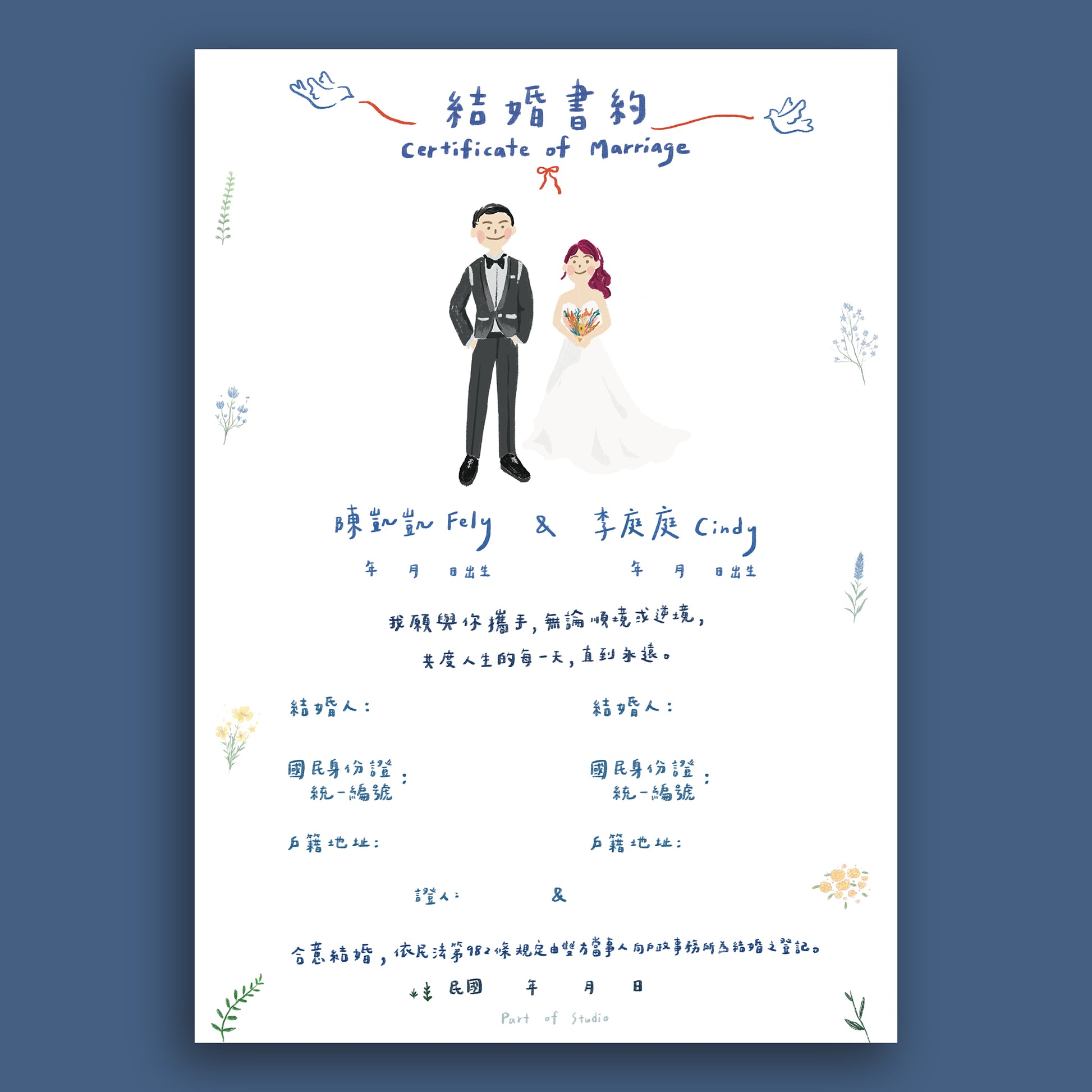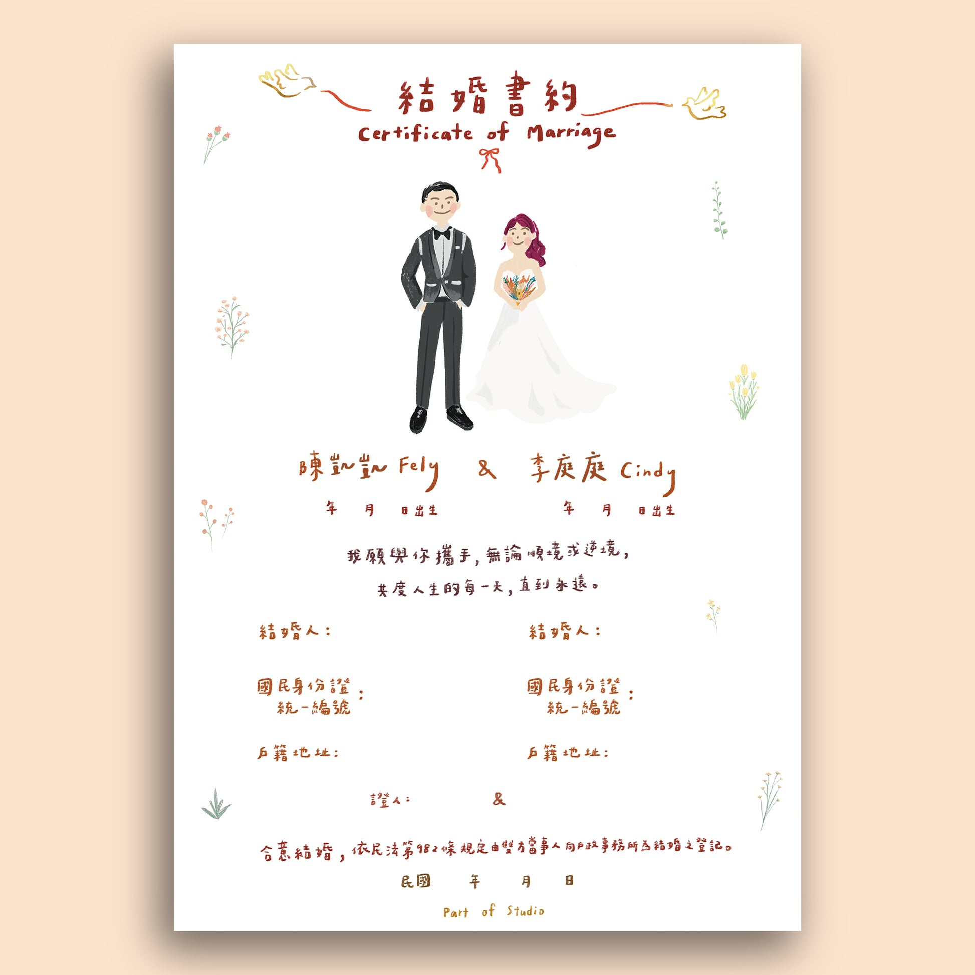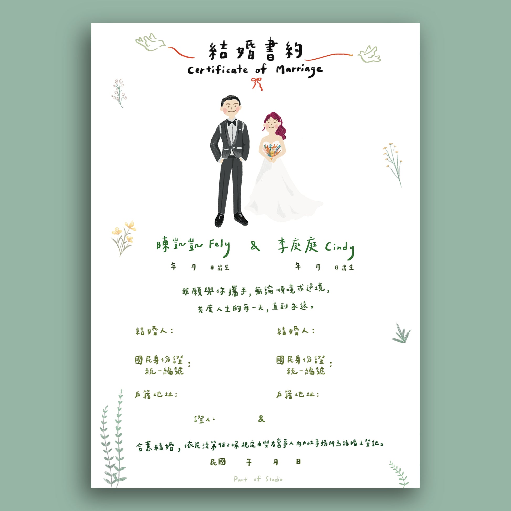 【附書約夾♡戶政可用】花草派對似顏繪結婚書約|部分工作室