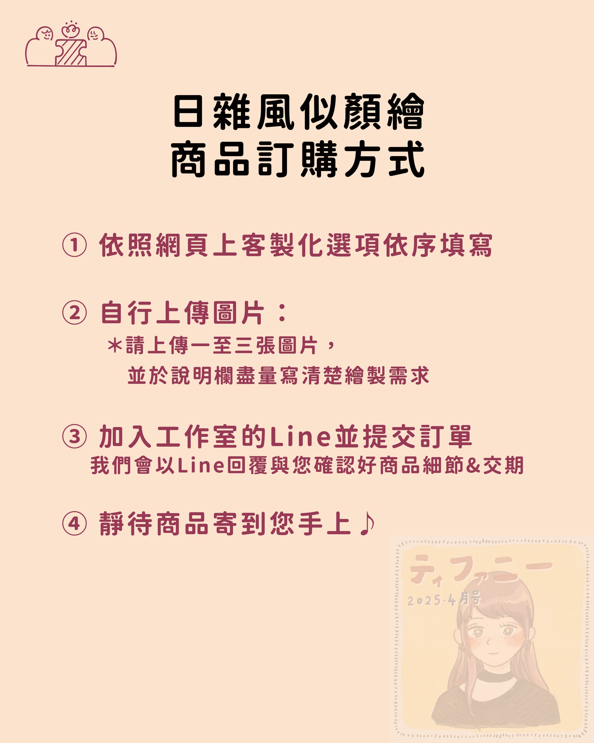 3. 開放小範圍修改乙次(我們將以 LINE 與您聯絡),不開放重新繪製 / 更換照片,請確認好喜歡我們的風格再下單呦